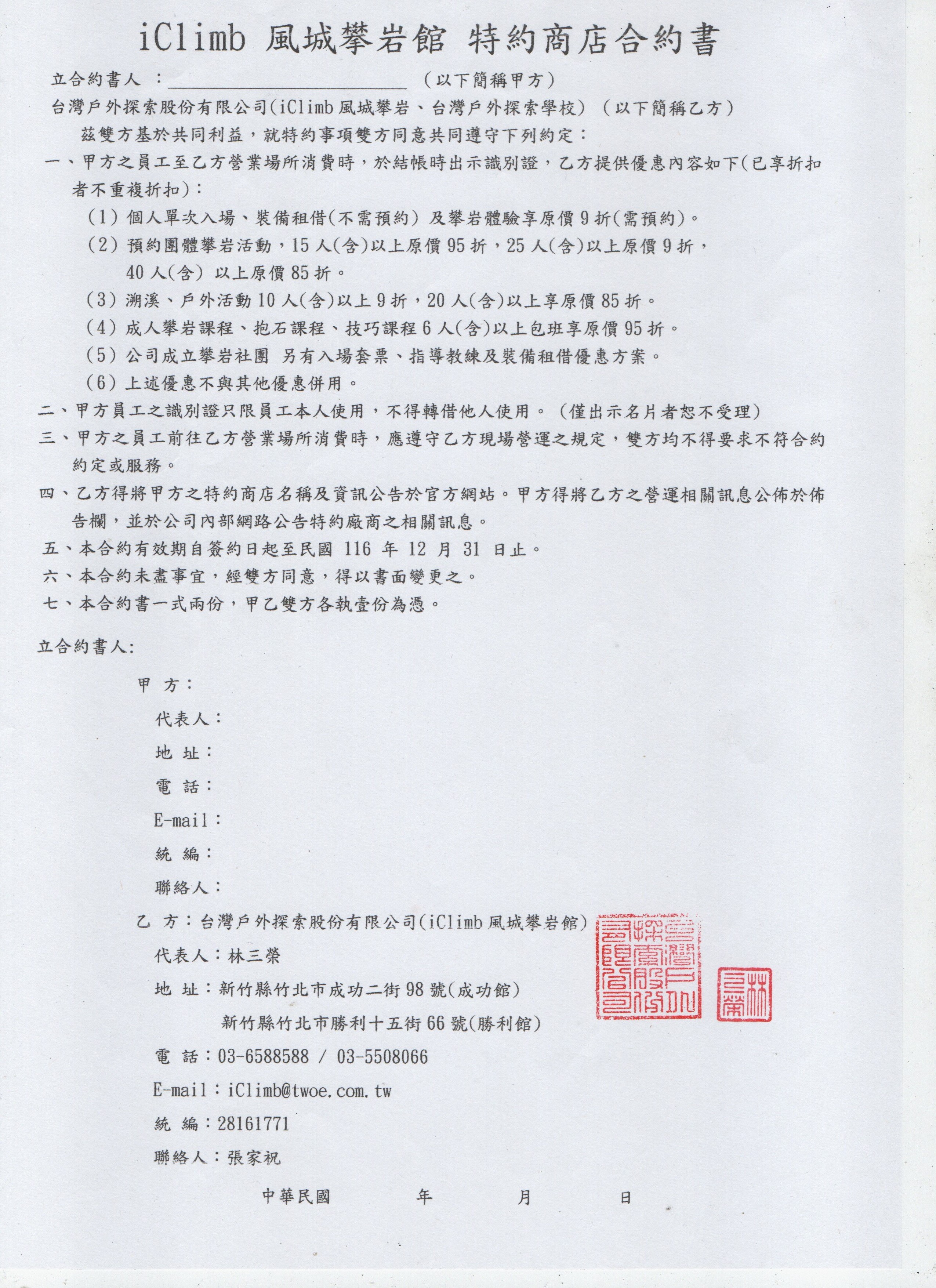 (2) 預約團體攀岩活動,十五人(含)以上原價九五折,二十五人(含)以上原價九折,四十一人(含) 以上原價八五折。(成功館及勝利館皆通用)