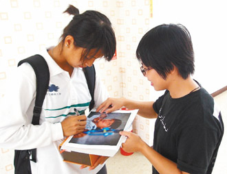 林佳恩(左)與林秀儒(右)同樣領取「代表國家參加國際競賽績優獎」。林秀儒在會場外,看見林佳恩,興奮地拿出已準備好的照片,請偶像林佳恩簽名。